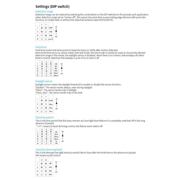 | Daylight sensor | 2Lux/10Lux/ 50lux/ Disable | |